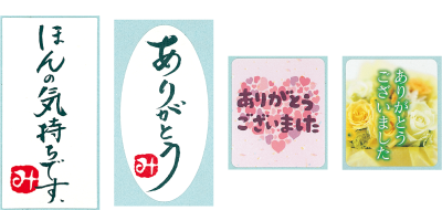 シールは「ほんの気持ちです」「ありがとう」「ありがとうございました(ハート柄)」「ありがとうございました(バラ柄)」の4種類からお選びいただけます。